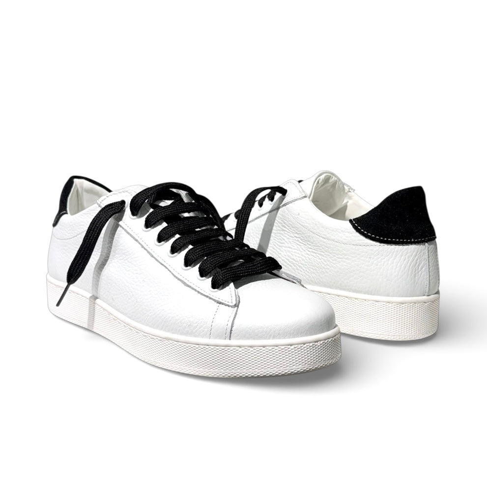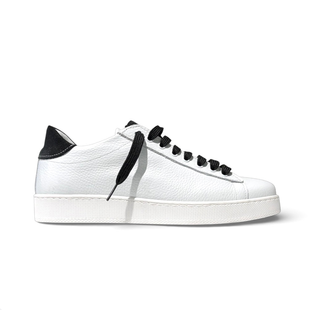 Sneakers in pelle bianca bottolata e con riporto in camoscio nero e laccio nero e porta il plantare anatomico estraibile.