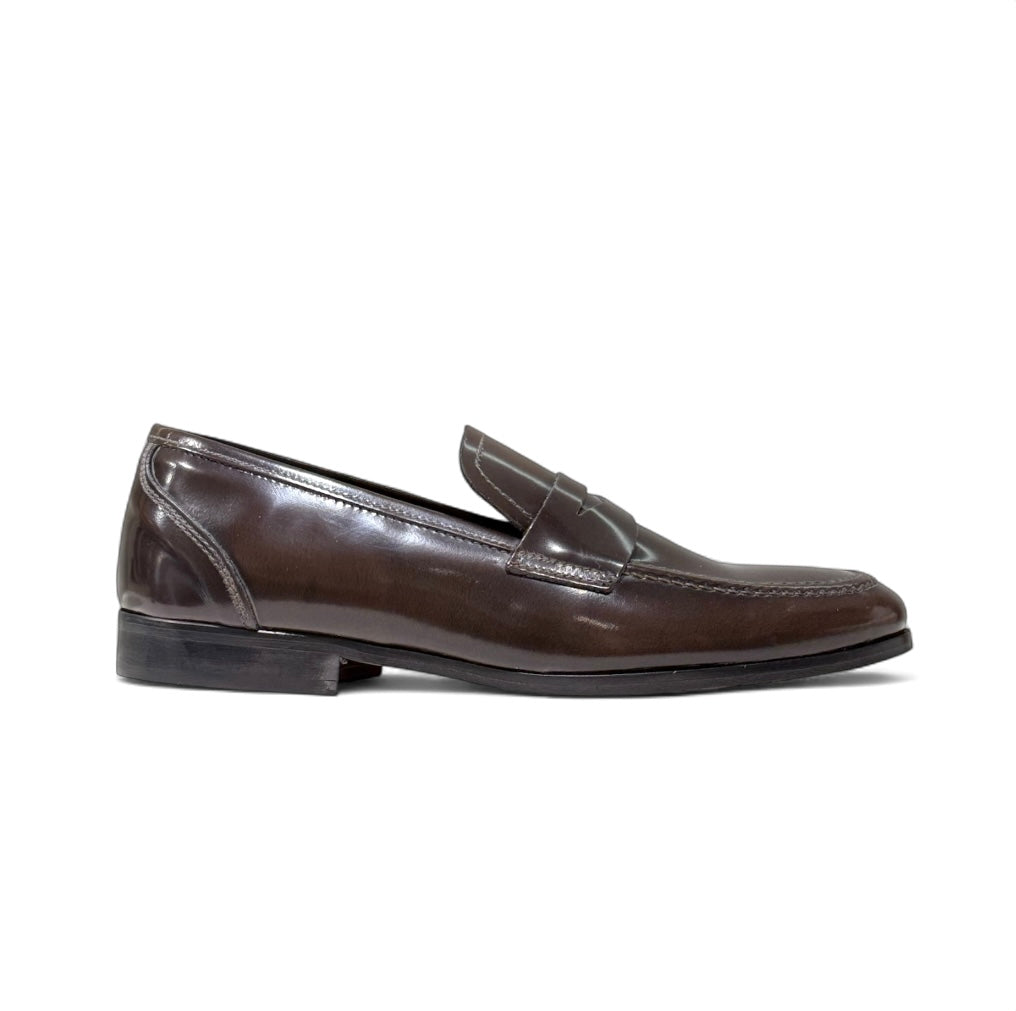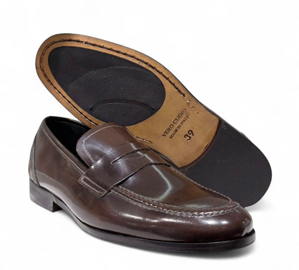 Mocassino in abbrasivato marrone e fondo cuoio cucito con antiscivolo.