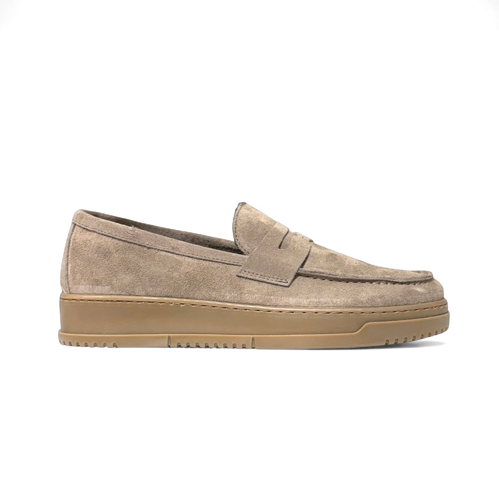 Mocassino in camoscio taupe con fondo ambra alto e sottopiede anatomico estraibile.