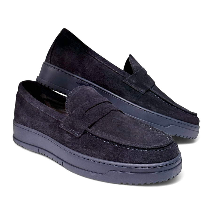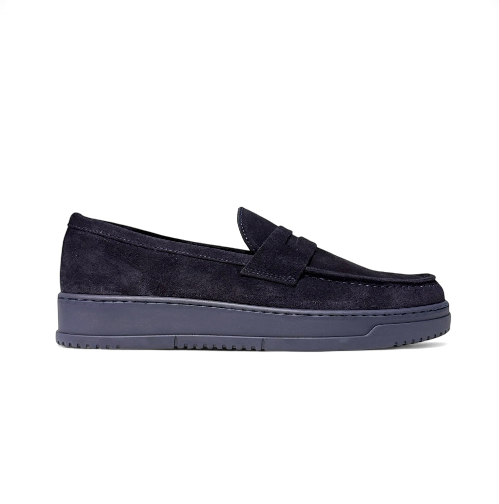 Mocassino in camoscio blu e fondo alto blu con sottopiede anatomico estraibile.