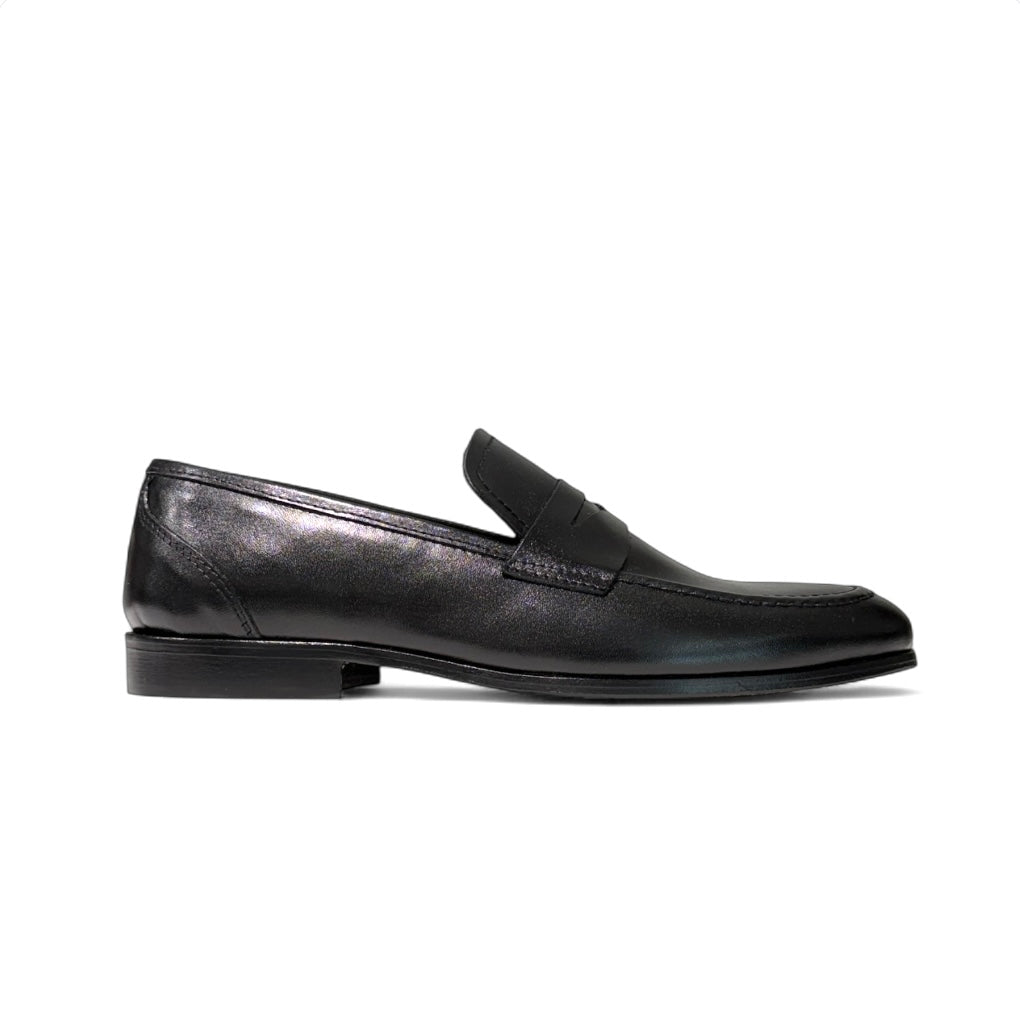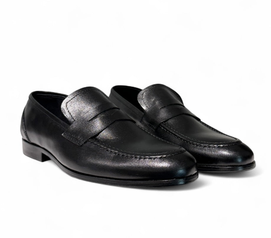 Mocassino con bendina in vitello nero e fondo cuoio cucito con antiscivolo e sottopiede in pelle.