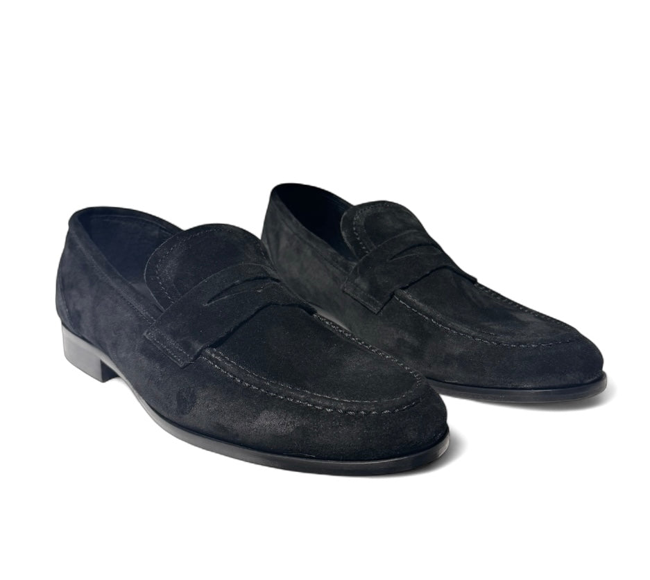 Mocassino con bendina in camoscio nero e fondo cuoio cucito con antiscivolo .
