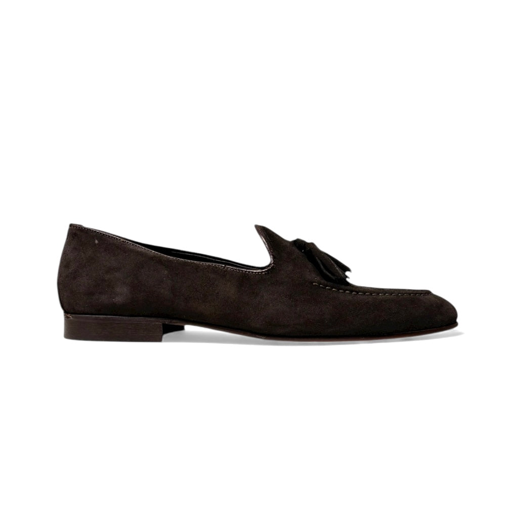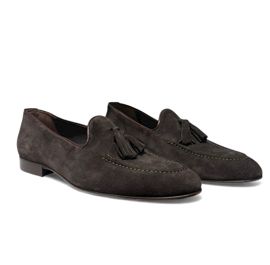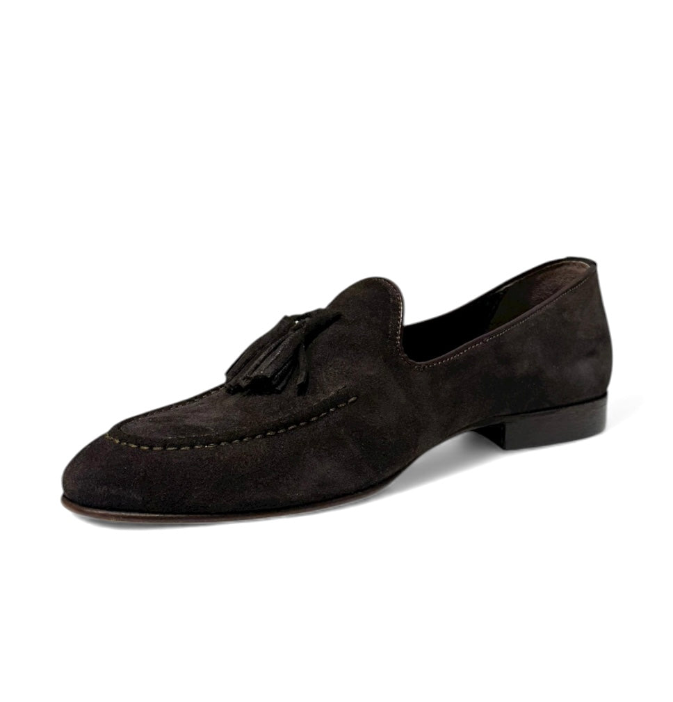 Mocassino con nappine in camoscio tmoro e fondo cuoio.