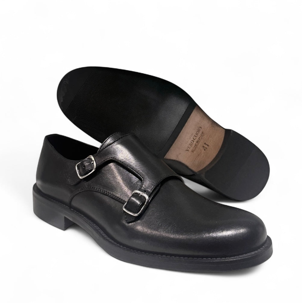 Doppia fibbia in vitello nero e fondo cuoio con gomma antiscivolo