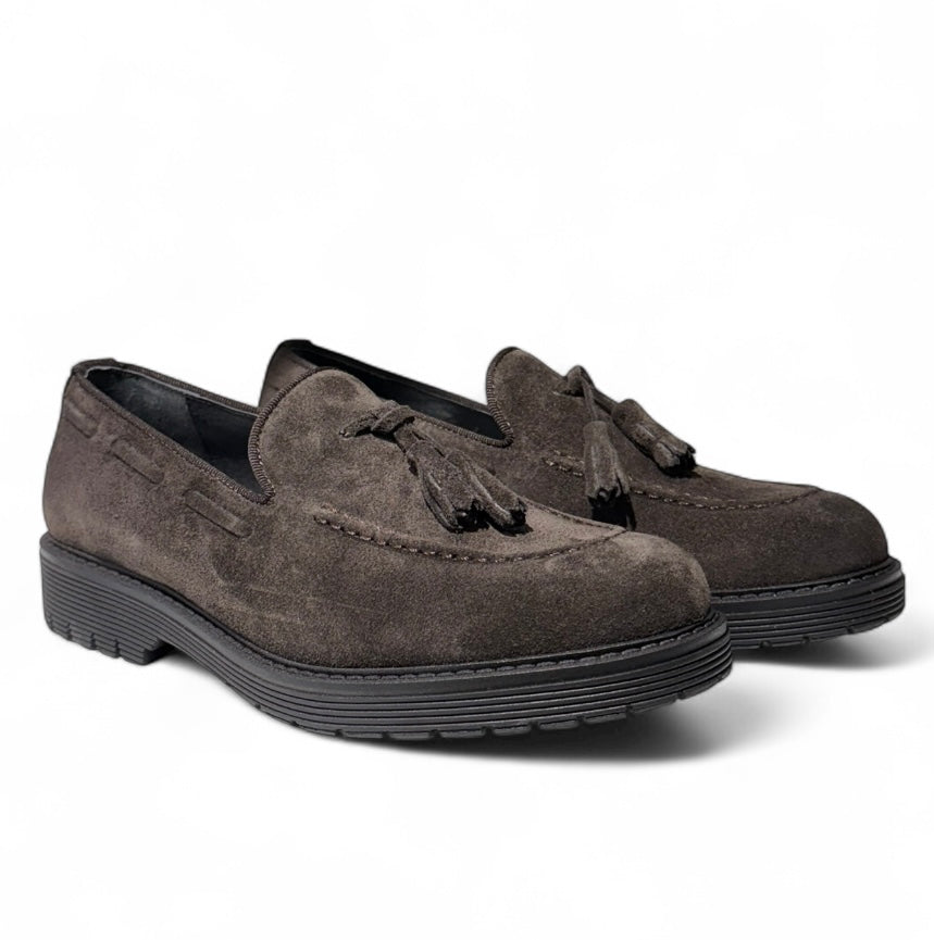 Mocassino con nappine in camoscio marrone e fondo gomma leggera.