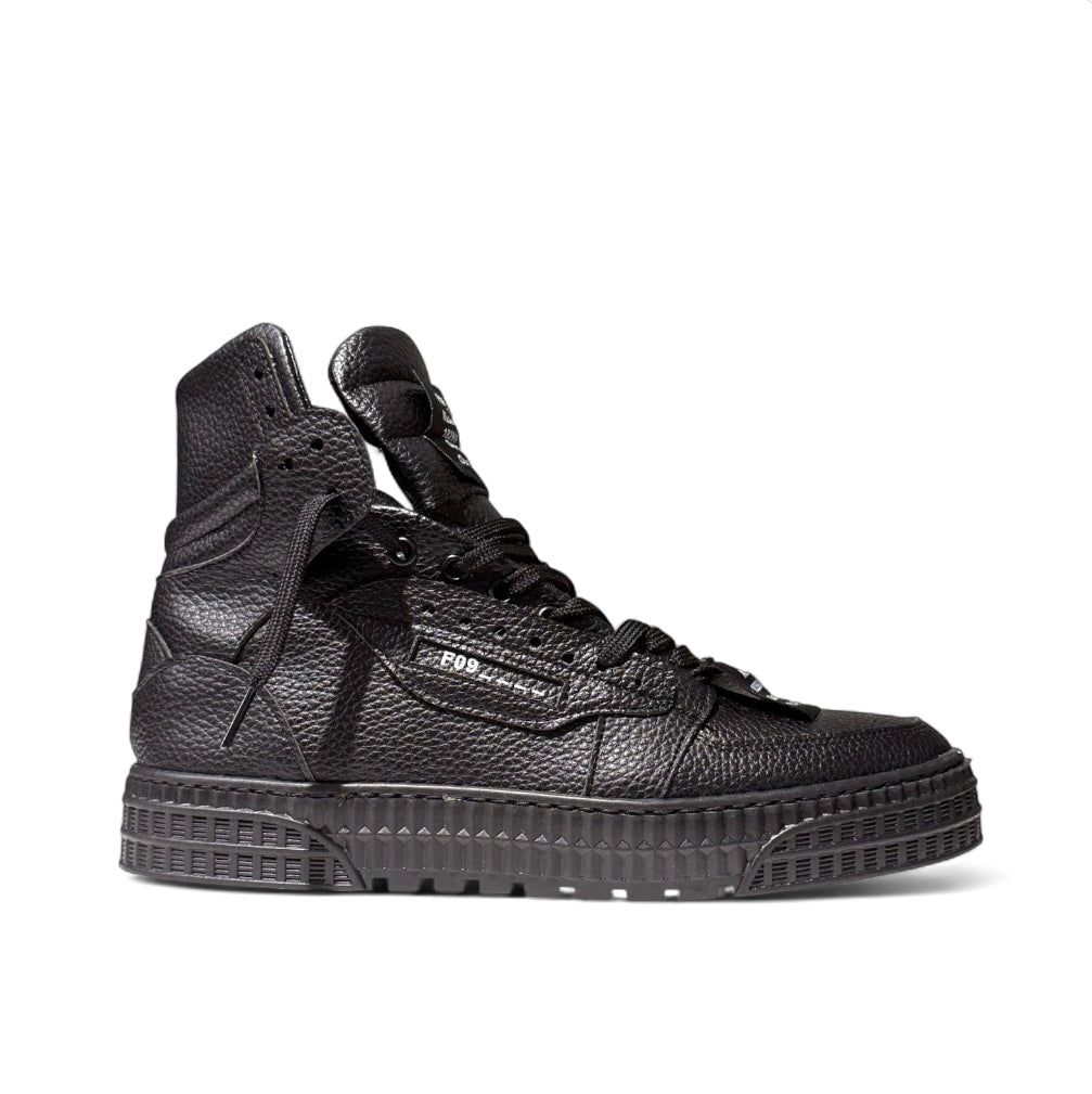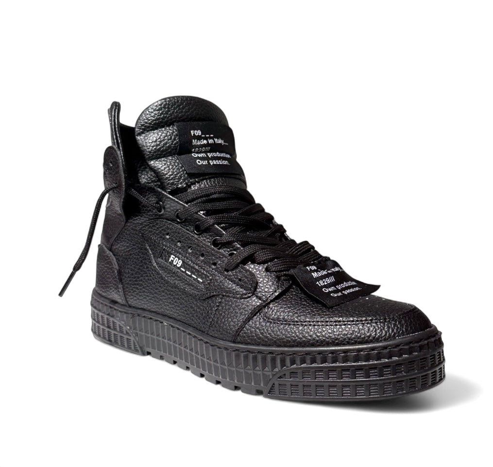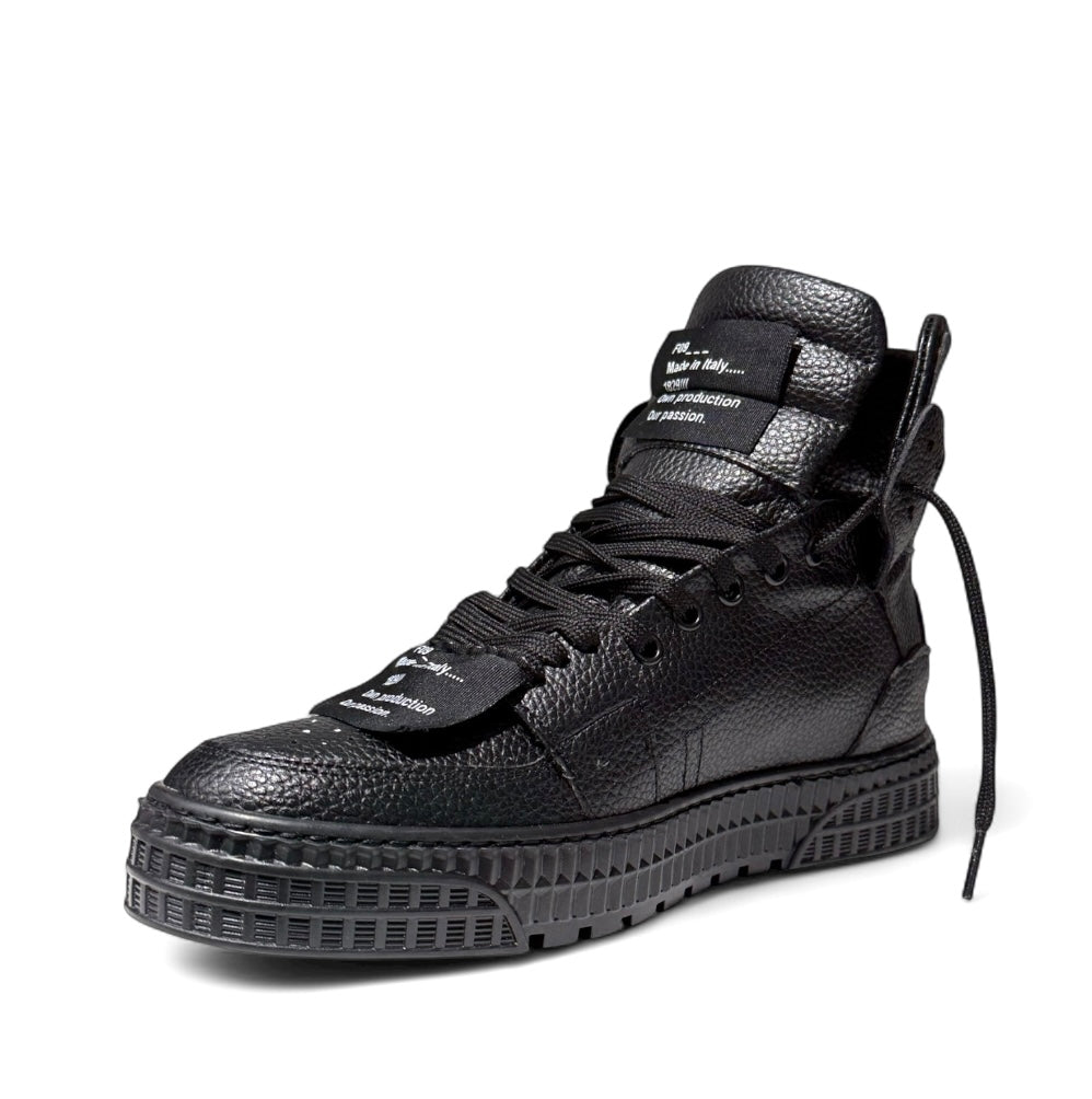 Sneakers alta in pelle martellata nera e doppia etichetta in tessuto nero.