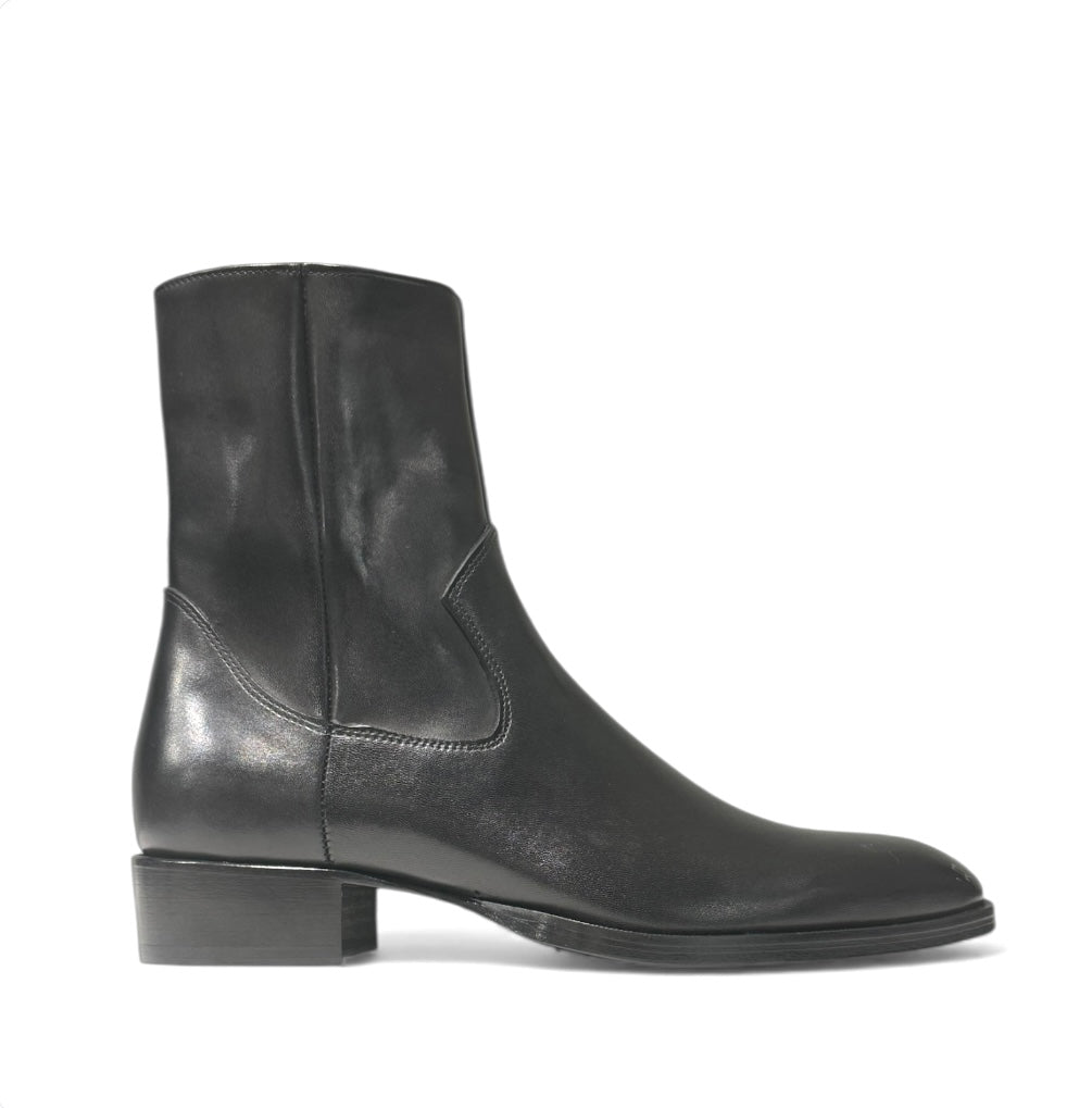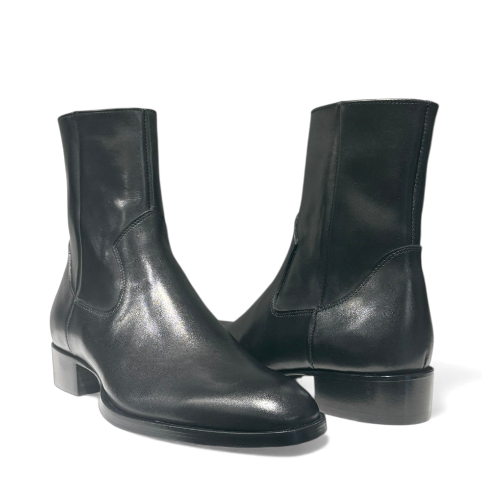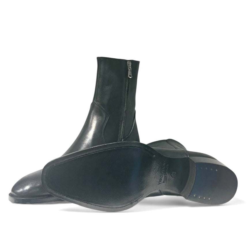 Stivale in vitello nero con cerniera interna in argento e fondo cuoio cucito .Prodotto definito con materiali di alta qualità per realizzare un connubio di stile e confort ..