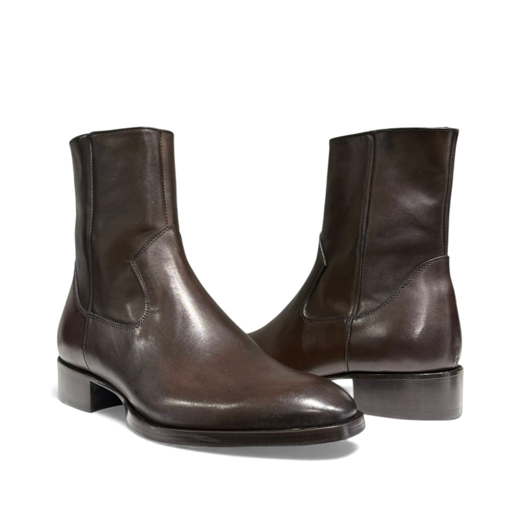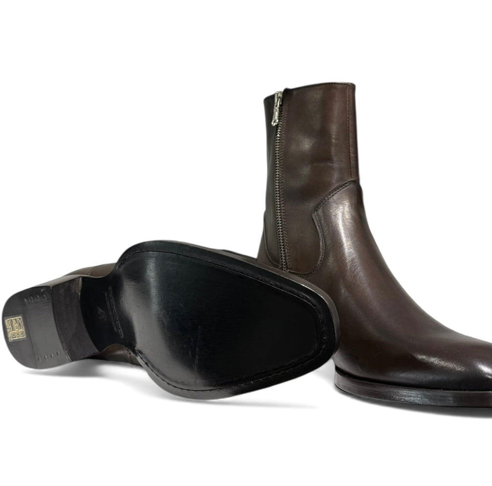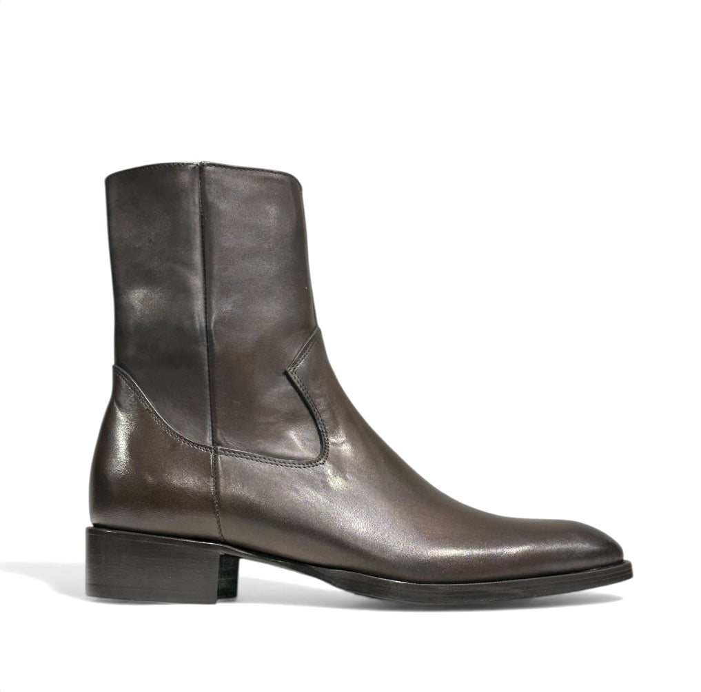 Stivale in vitello testa di moro con cerniera interna e tacco e fondo cuoio cucito.