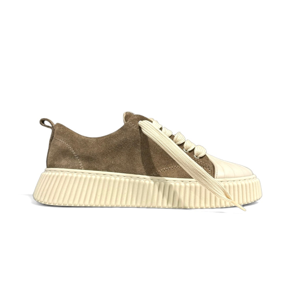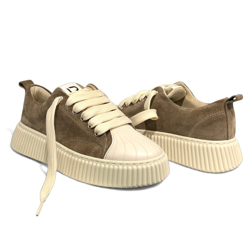 Sneakers in camoscio beige e porta fondo e punta rigata beige ultra leggera e laccio XL beige.