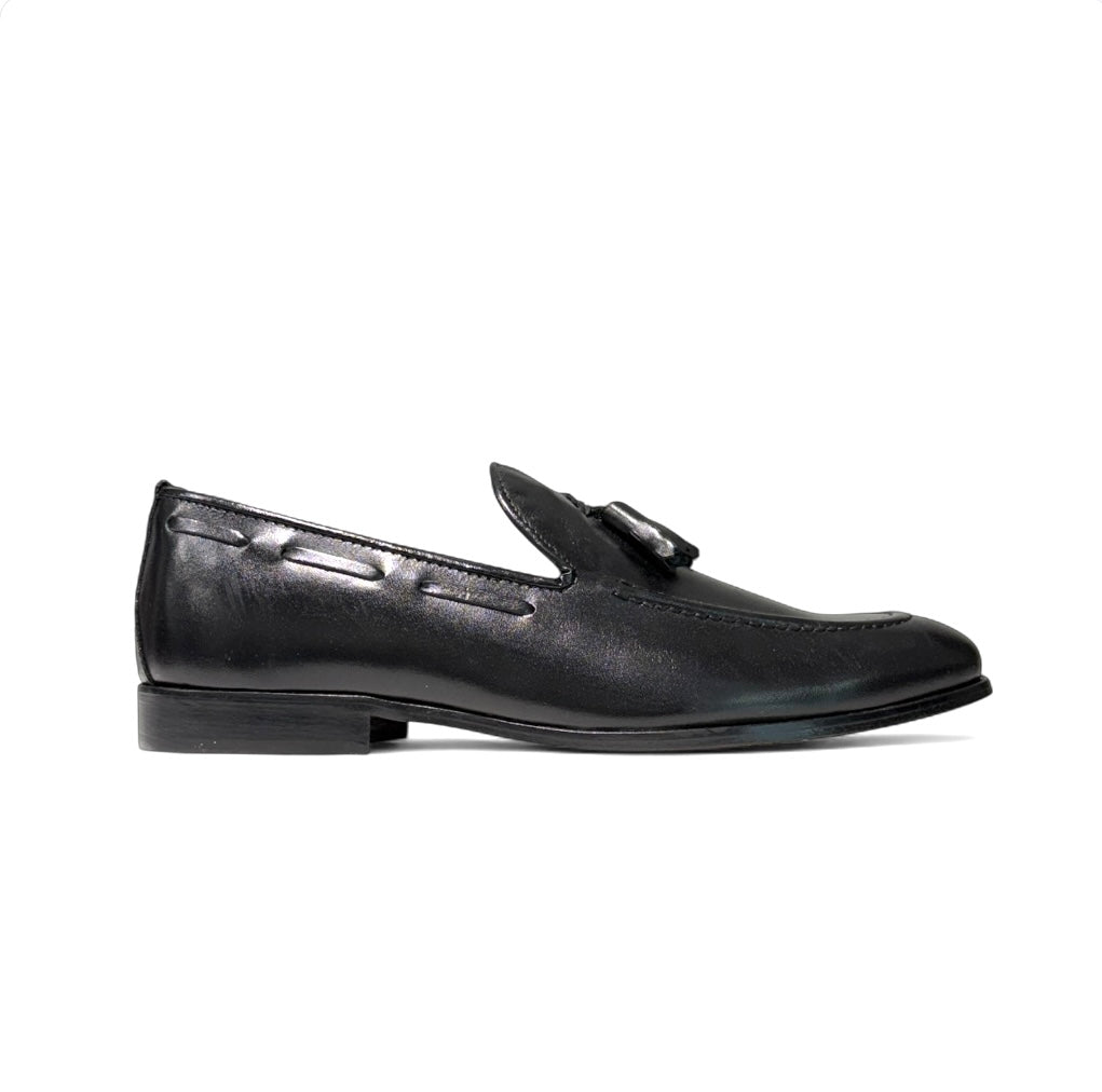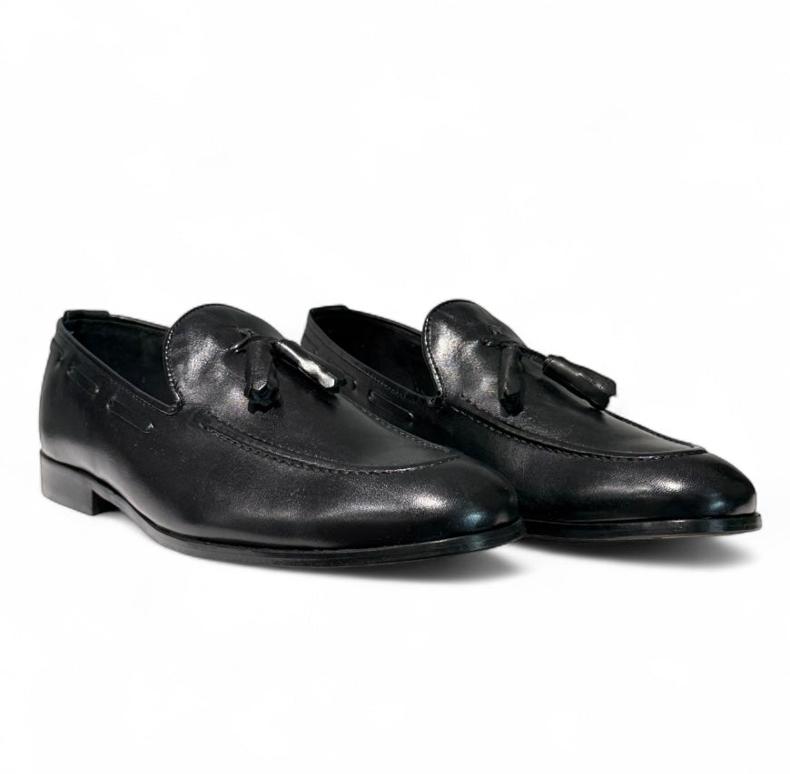 Mocassino con nappine in vitello nero e fondo cuoio cucito con antiscivolo e sottopiede in pelle.