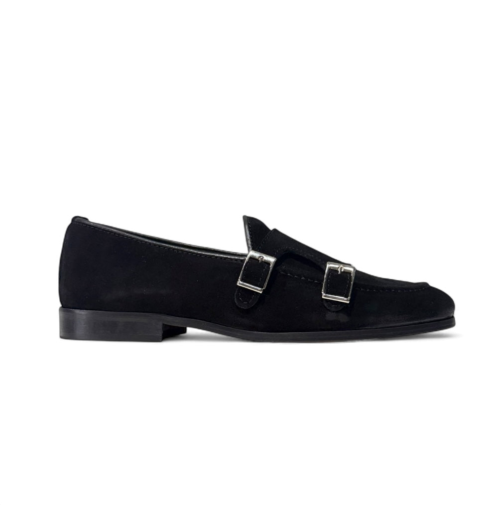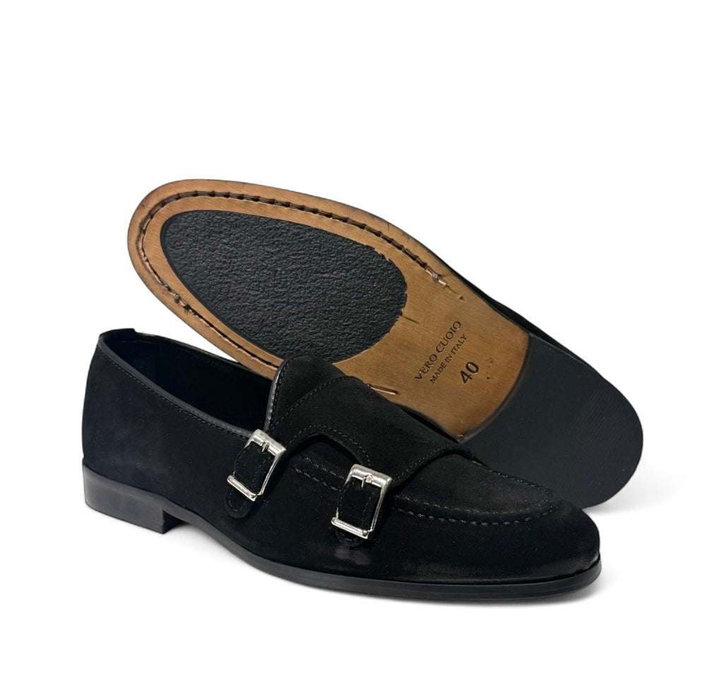 Mocassino con fibbia in camoscio nero con sottopiede in pelle e fondo cuoio cucito con antiscivolo.