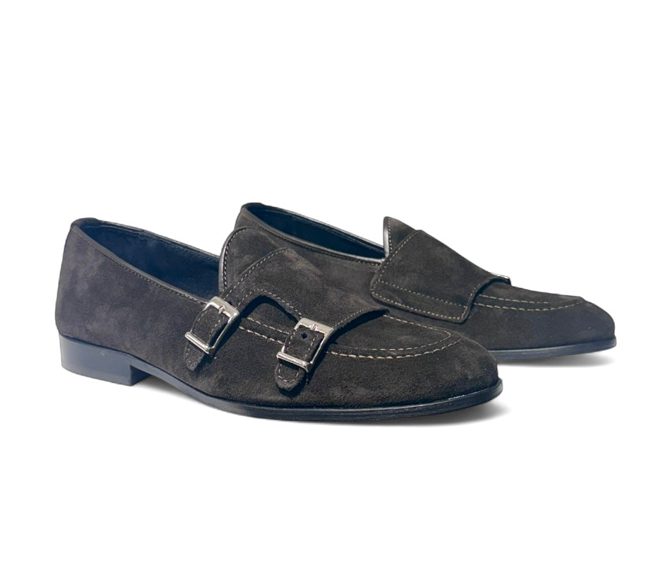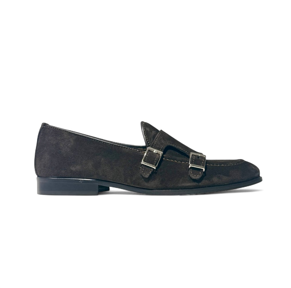 Mocassino con fibbie argento in camoscio t Moro e fondo cuoio cucito con antiscivolo .