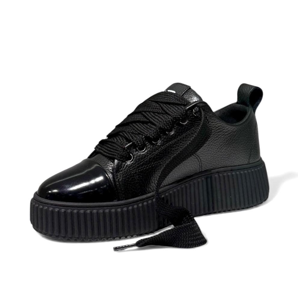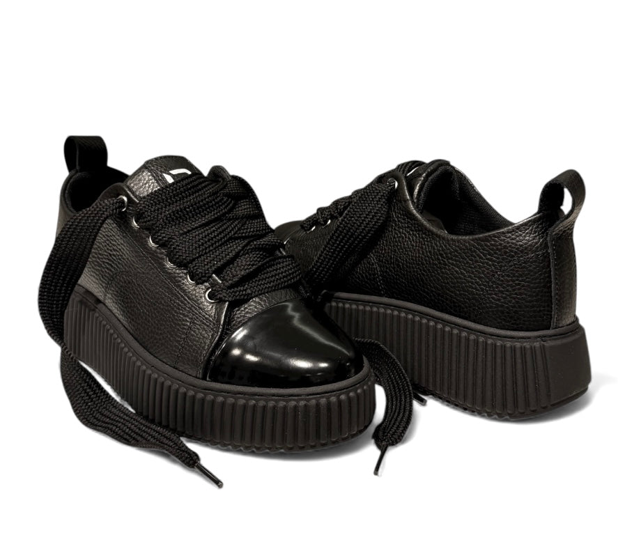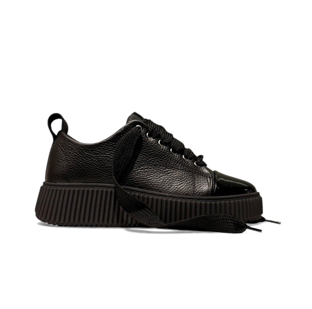 Sneaker in bottolato nero con fondo magan nero e punta in vernice con laccio doppio nero.