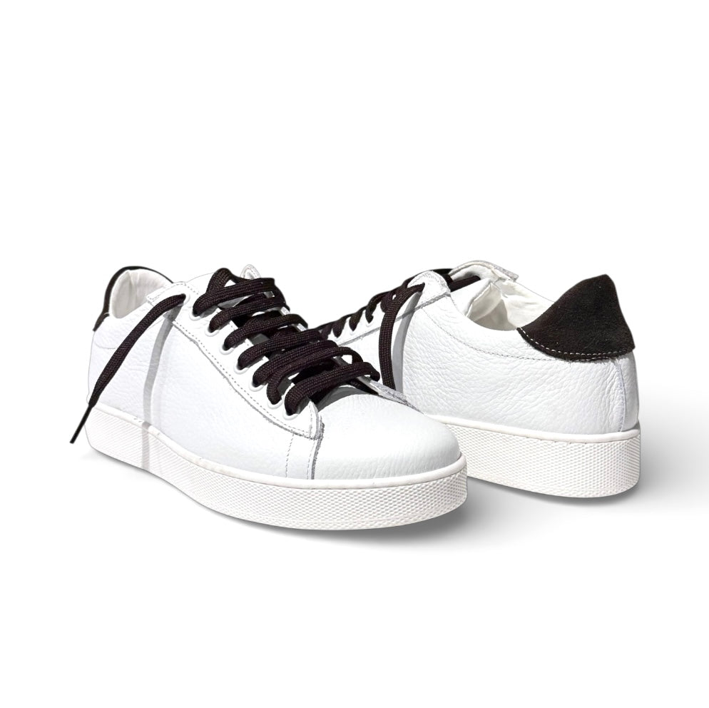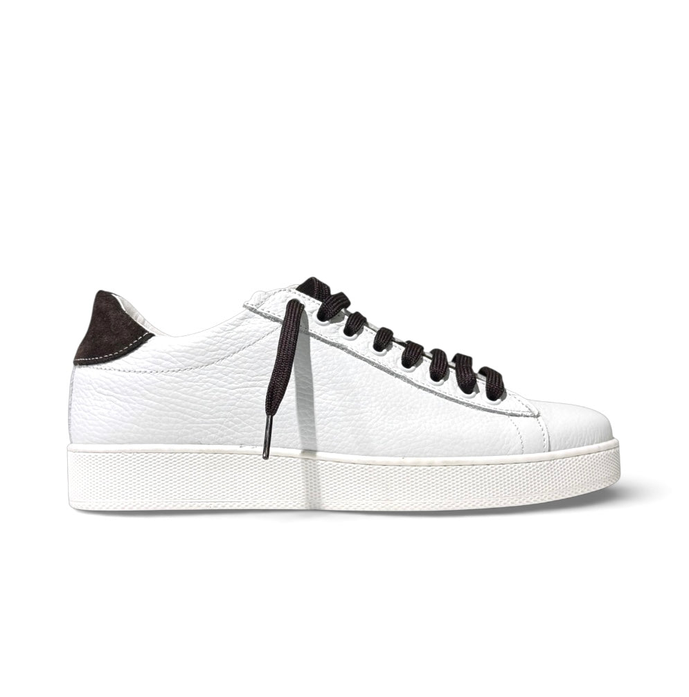Sneakers in pelle bianca bottolata con riporto in camoscio testa di moro e laccio abbinato e porta il plantare anatomico estraibile .