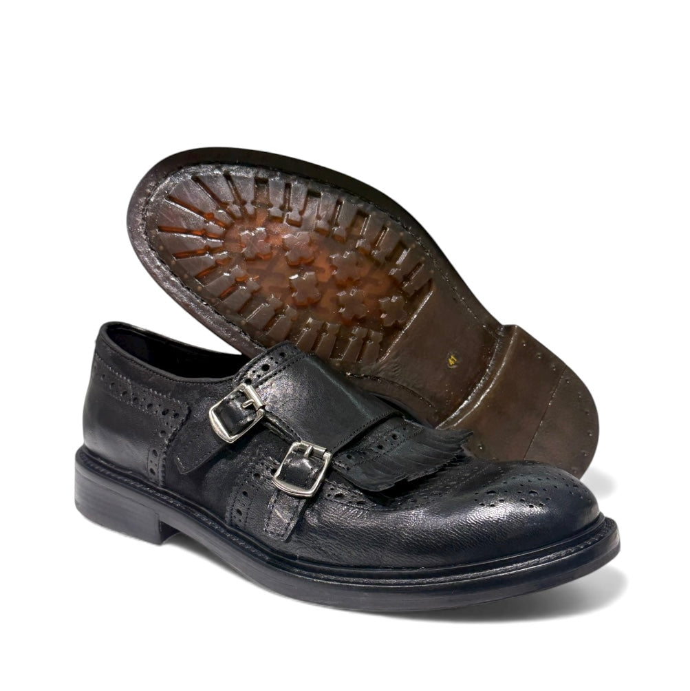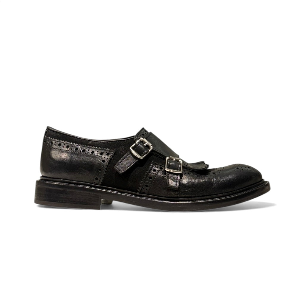Mocassino con doppia fibbia e frangia in vitello nero con alcune rifiniture in camoscio e fondo cucito.
