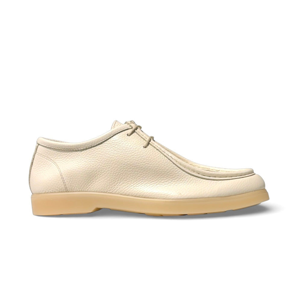 Modello ingegnere ultra leggero prodotto con pellame sfoderato bottolato bianco latte con fondo creap che formano un insieme di eleganza e confort.