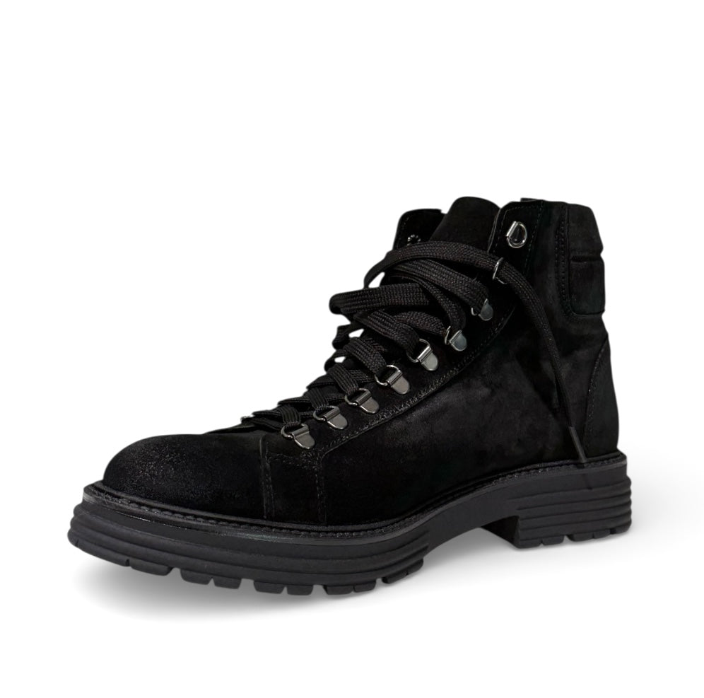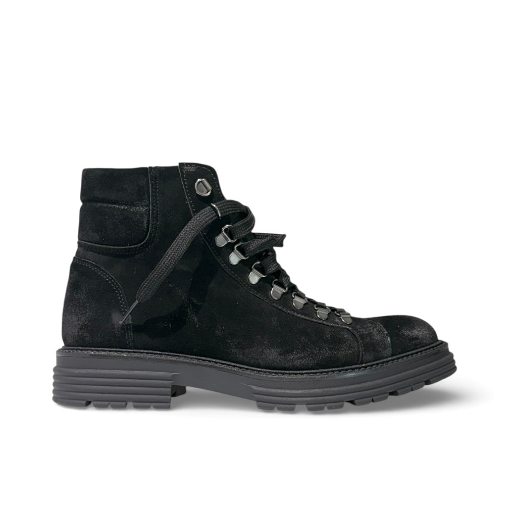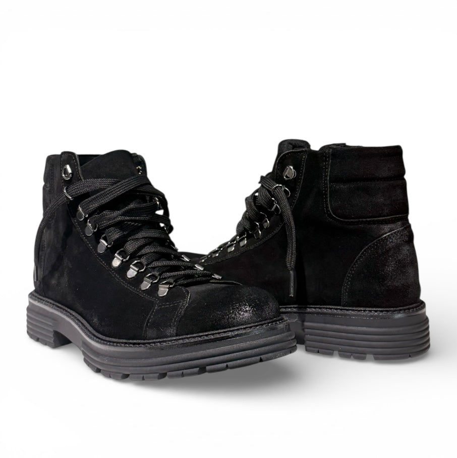 Stivale in camoscio nero con ganci e fondo gomma ultra light..