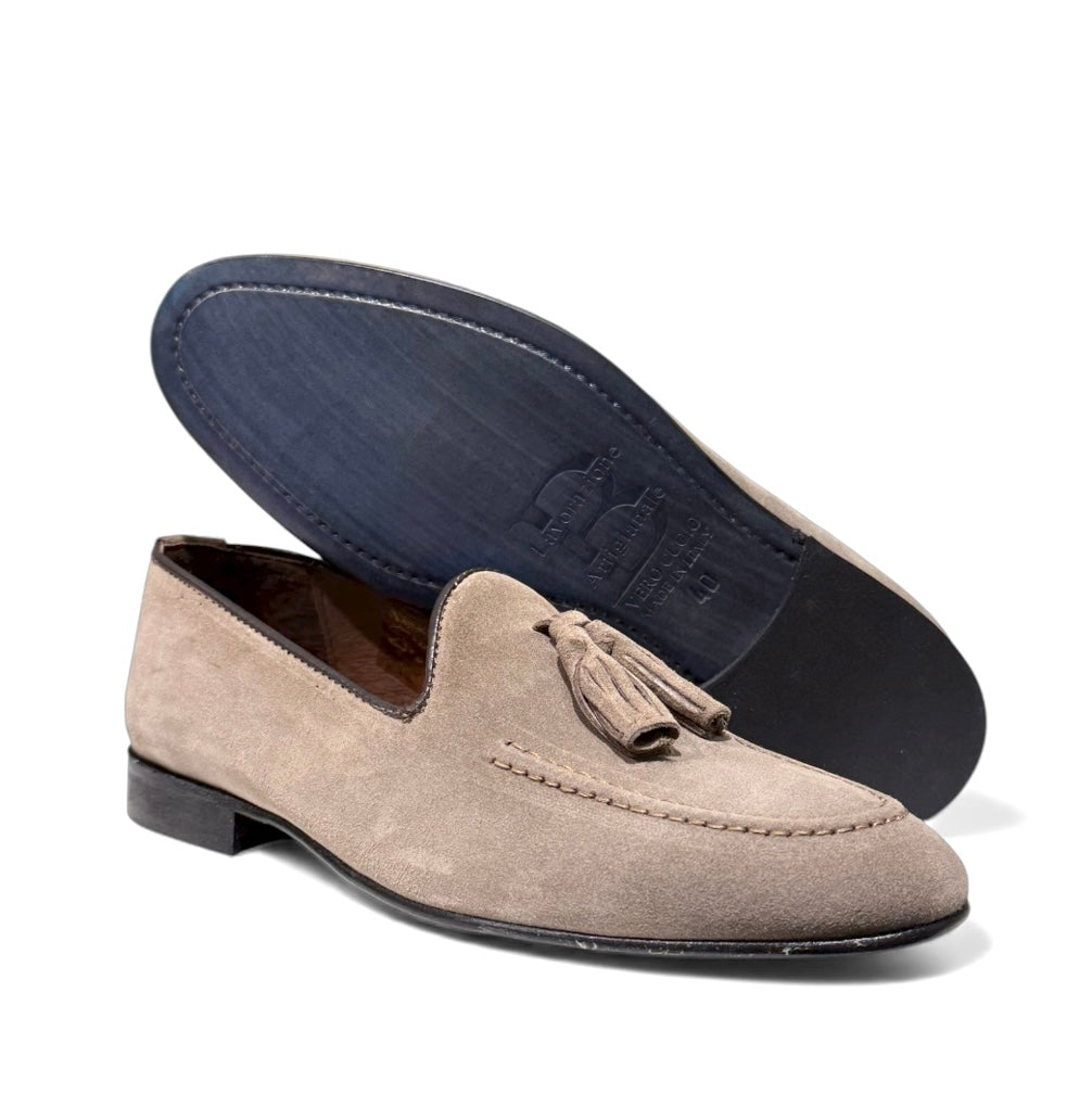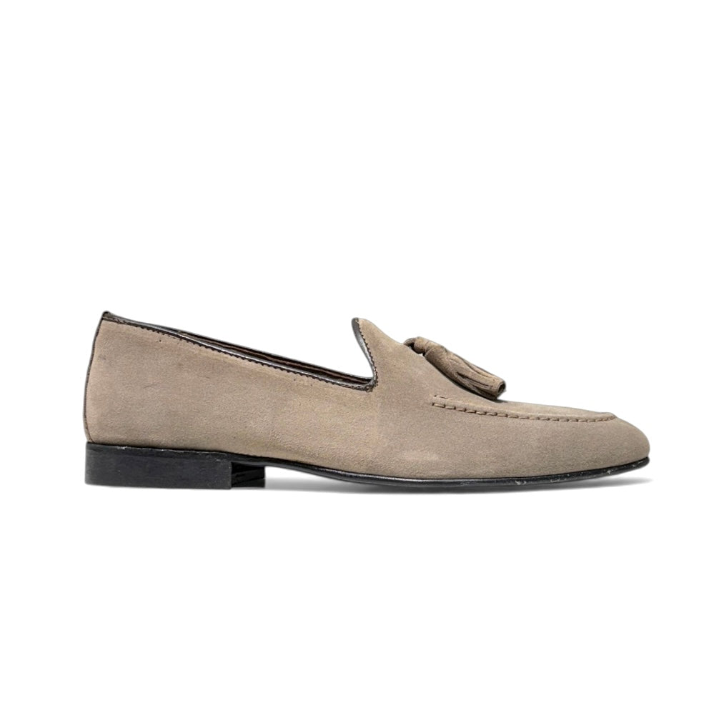 Mocassino con fiocco in camoscio beige e fondo cuoio.
