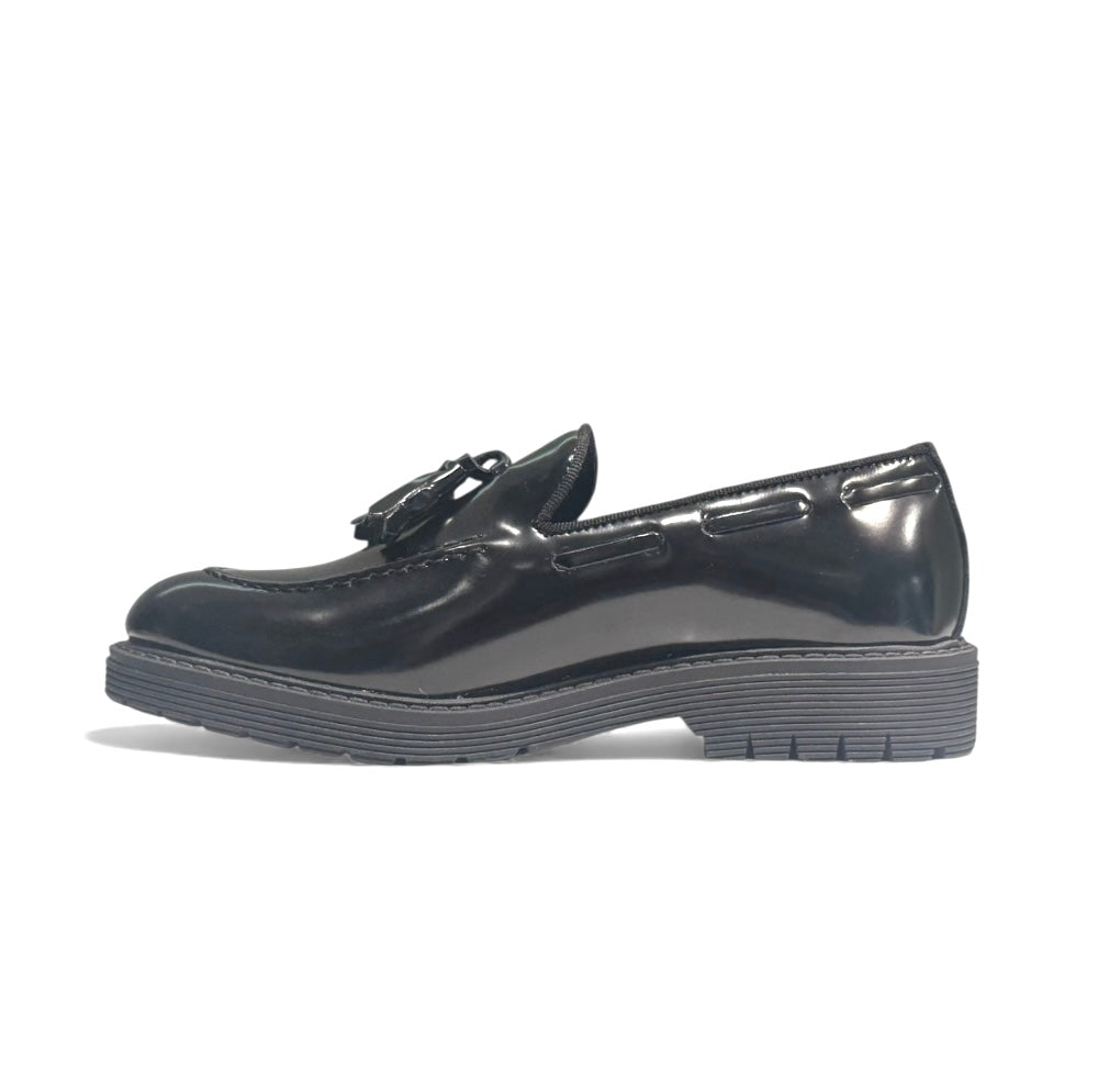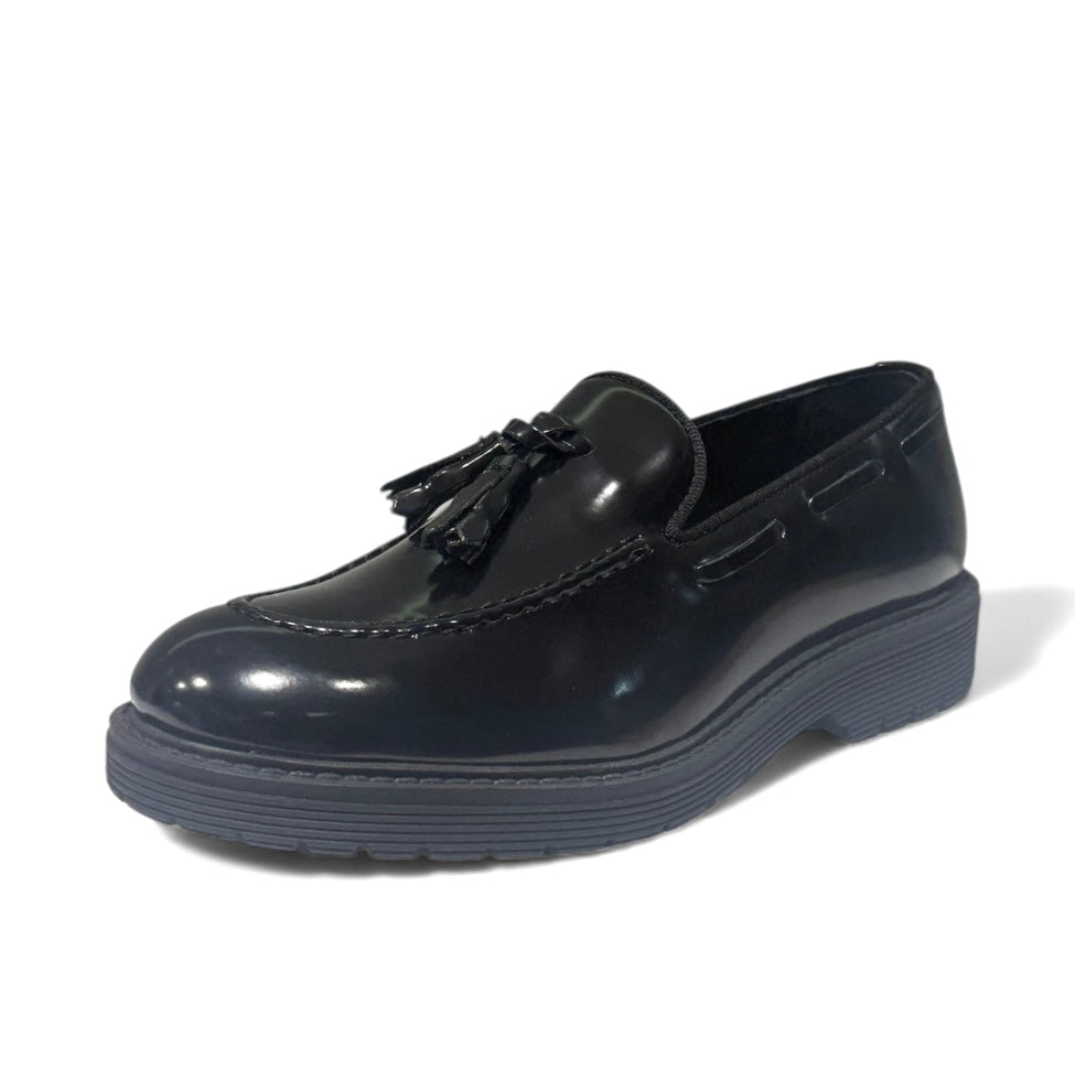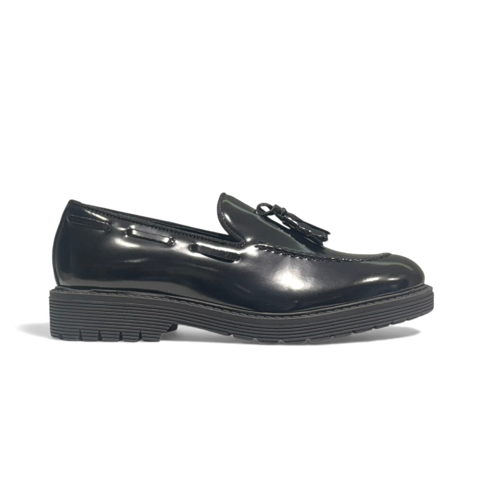 Mocassino con nappine in abbrasivato nero e fondo gomma ultra leggera .