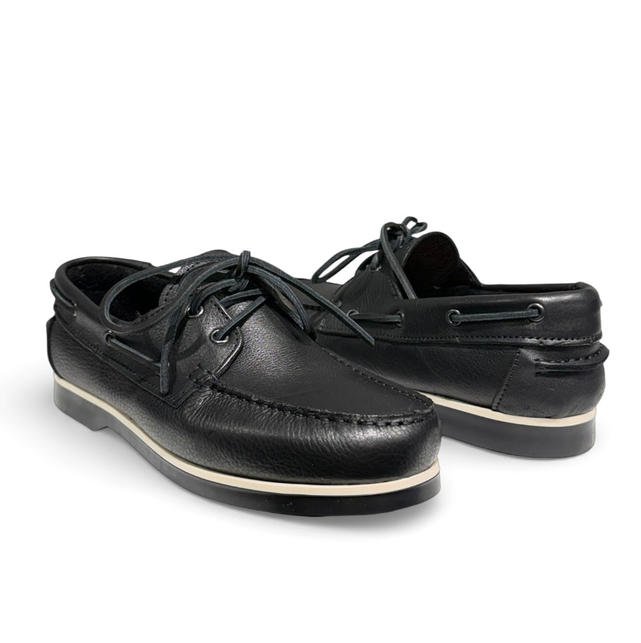 Mocassino con bendina in pelle nera e fondo bianco ultra leggero e porta il sottopiede in pelle estraibile.